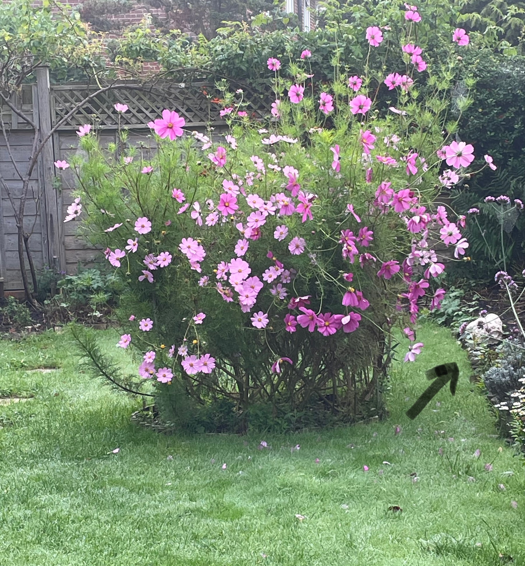 Shades of Autumn and quite a heavy dew this morning. I grew these Cosmos from a packet of seed from my store which were 3 years out of sow by date; they were supposed to be ‘up to 45cm tall ‘ (18 inches in old money)! The Puffball mushroom is the 5th one that I have found in my garden which I intend to leave to see how big it gets!