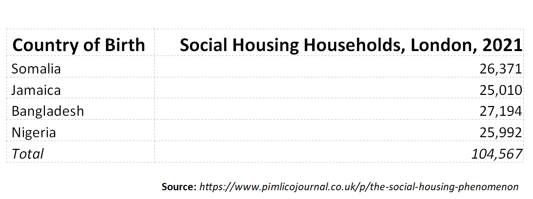People born in just four countries - Somalia, Jamaica, Bangladesh and Nigeria - occupy a combined 104,567 social homes in London.