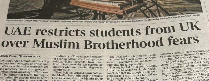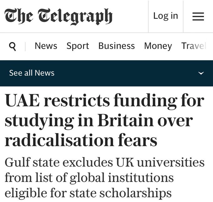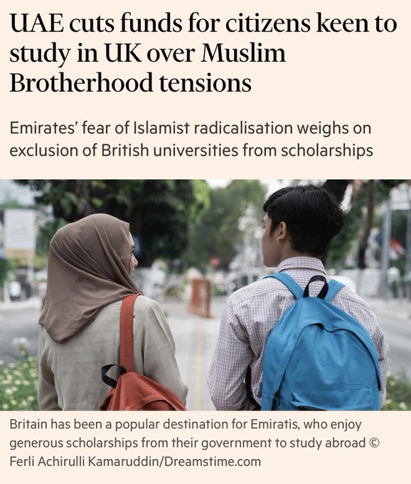 The UAE announces it will cuts funds for citizens who want to study in the UK out of fear of Emirati students being radicalized by Muslim Brotherhood Islamists on British campuses!