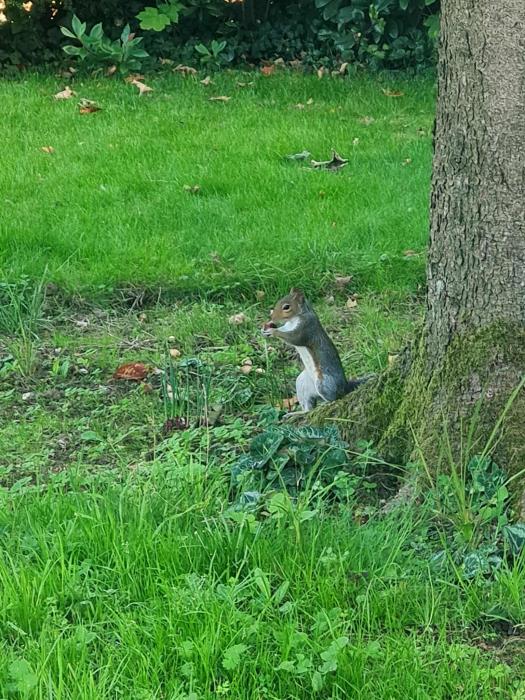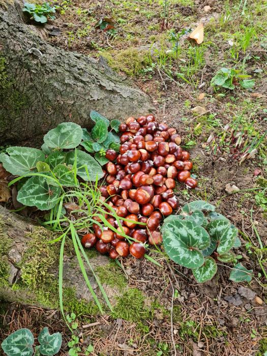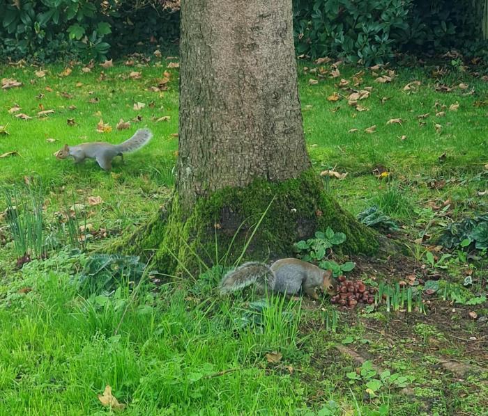 Also made somewhat of a mistake regarding the squirrel. Brought home a load of sweet chestnuts (and I do mean load as there are hundreds of them on the floor of the woods) thinking Sid would eat them, but in fact he's saving them for later. This consists of planting them in the other half of the lawn that the hedgehog hasn't dug up. He works fast: pick up nut, select spot, scoop up earth, drop nut, pat down earth, go back for next nut.
